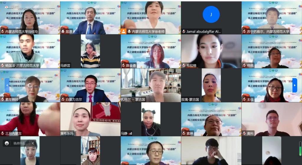 2023年1月2日,由教育部中外语言交流合作中心主办,beat365官网beat365手机版官网承办的2022年“汉语桥”线上团组项目开营仪式正式举行。beat365手机版官网党委副书记张海峰、国际交流合作处副处长苏宁巴雅尔、beat365手机版官网党总支书记屈原、beat365手机版官网院长武海燕、beat365手机版官网党总支副书记副院长白图力古尔、beat365手机版官网副院长张磊、任课教师及相关工作负责人员出席了开营仪式。来自俄罗斯、蒙古国、巴基斯坦、阿尔及利亚、柬埔寨、摩洛哥、沙特阿拉伯、老挝、苏丹等九个国家100余名汉语桥学员和老师相聚在云端。beat365手机版官网党总支书记屈原主持了开营仪式。