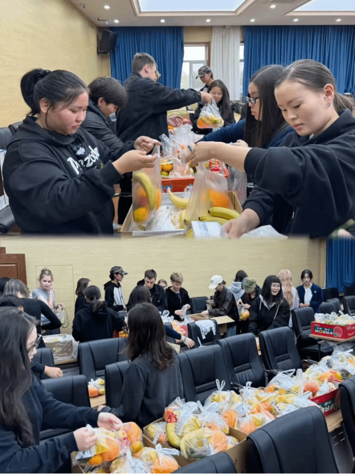 国内外学生同老师们齐心协力,化身成为“爱心包装工”,为留校的同学们亲手包装一份份满载心意的中秋礼包。苹果寓意平安顺遂,香蕉形似明月寄托相思,橘子代表吉祥如意,月饼则是团圆美满的象征——这份心意,承载着学院对学子们最诚挚、最细腻的祝福。
