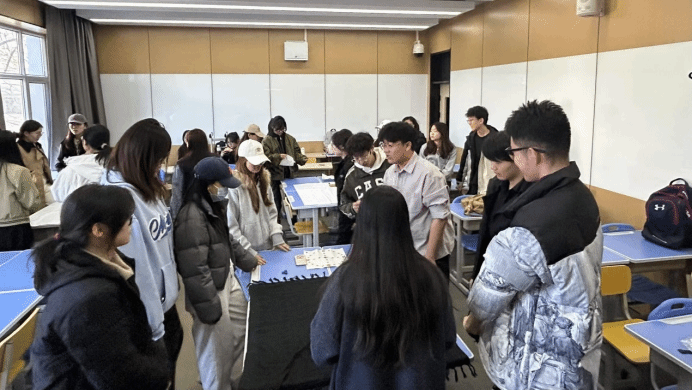 首先金泽洙老师向同学们介绍了韩国传统游戏“尤茨”的规则和玩法。尤茨,作为一种古老的韩国棋类游戏,不仅是一种娱乐方式,更是韩国文化的重要组成部分。通过老师们的讲解和示范,同学们对这一传统游戏有了初步的了解。