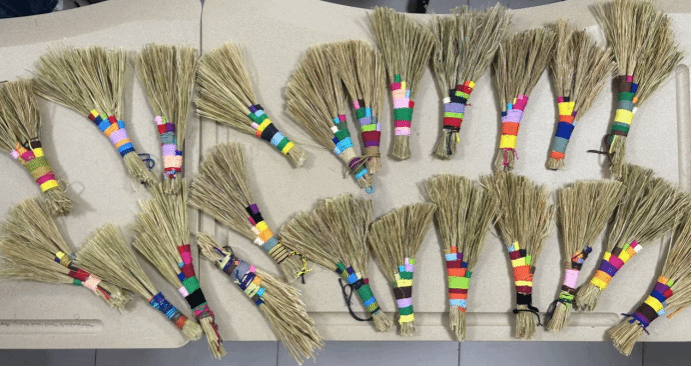 在实践环节中,同学们运用苎麻、彩线等材料,通过缠绕等技法进行手工制作。经过近两小时的精心制作,所有同学均成功完成了个性化的传统工艺扫帚作品。本次活动将文化认知与实践操作相结合,既锻炼了学生的动手能力,也加深了他们对韩国传统工艺美学的理解,有利于同学们熟悉相关韩语的实用场景,进一步提高韩语实践水平。