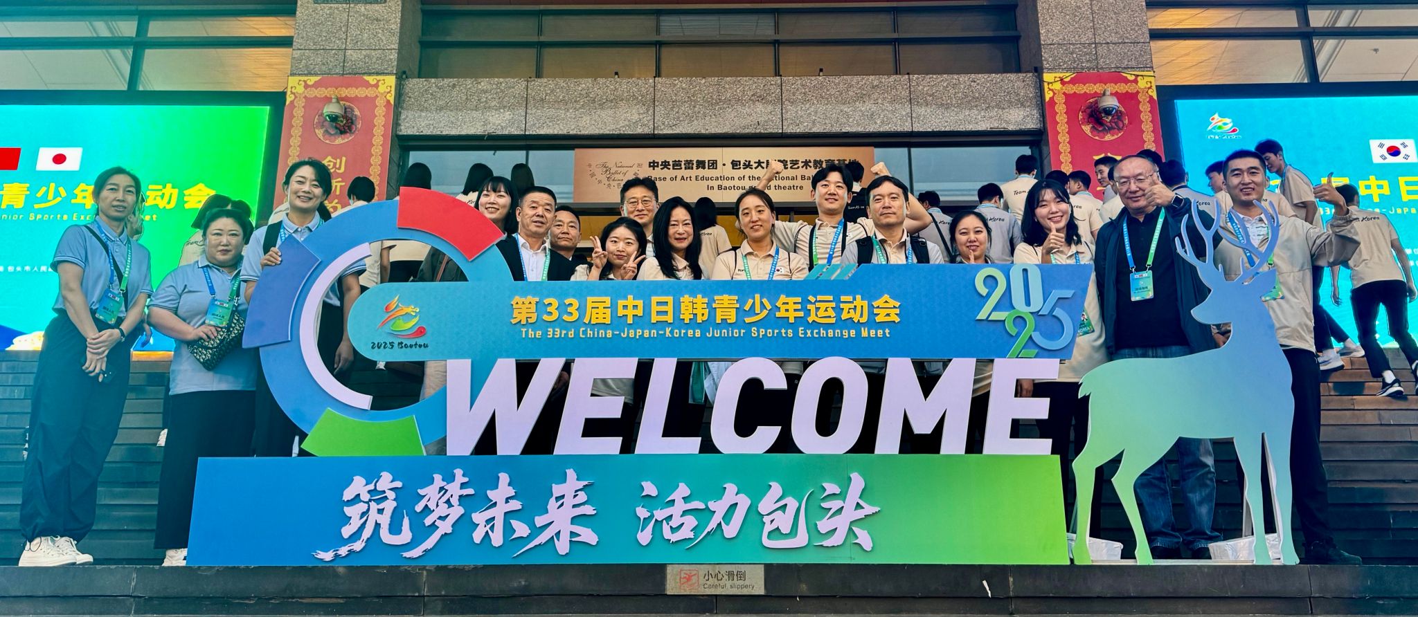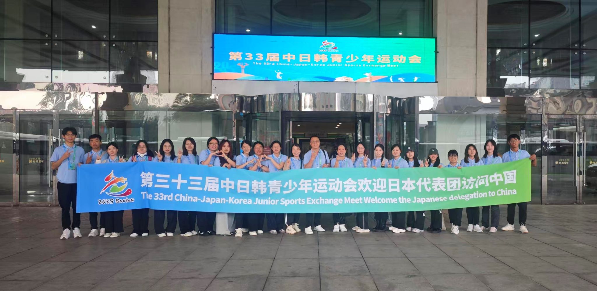由中华全国体育总会主办,内蒙古自治区体育局和包头市人民政府承办的第33届中日韩青少年运动会,于2025年8月23日至29日在包头市成功举办。beat365官网派出日语和朝鲜语两个专业的师生组成翻译团队,包括6名教师和44名学生,全程参与赛事服务工作。他们凭借出色的语言能力和专业的服务水准,为赛事的顺利举办提供了重要保障。