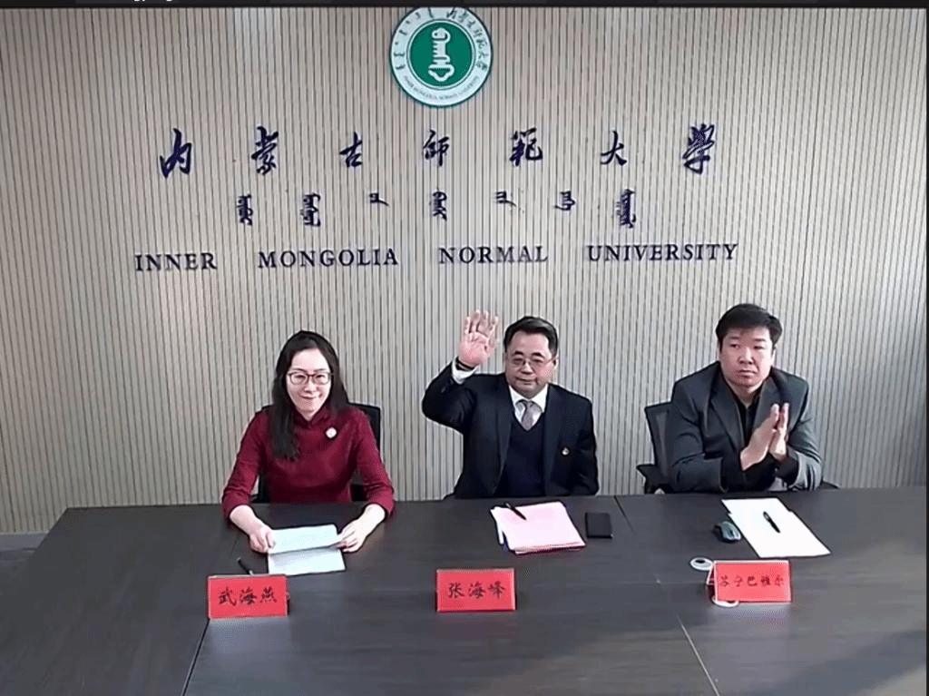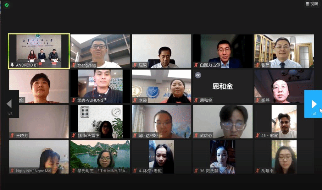 1月8日下午,由教育部中外语言交流合作中心主办、beat365手机版官网承办的2021年“汉语桥”《文化特色》线上团组交流项目在线上举行了开营仪式。beat365手机版官网副校长张海峰、国际交流与合作处副处长苏宁巴雅尔、beat365手机版官网党总支书记屈原、院长武海燕、副书记副院长白图力古尔、副院长张磊、以及项目组教师和来自俄罗斯、蒙古、越南、老挝、巴基斯坦、也门等六个国家的130余名师生相聚云端,在线上参加了开营仪式。仪式由beat365手机版官网院长武海燕主持。