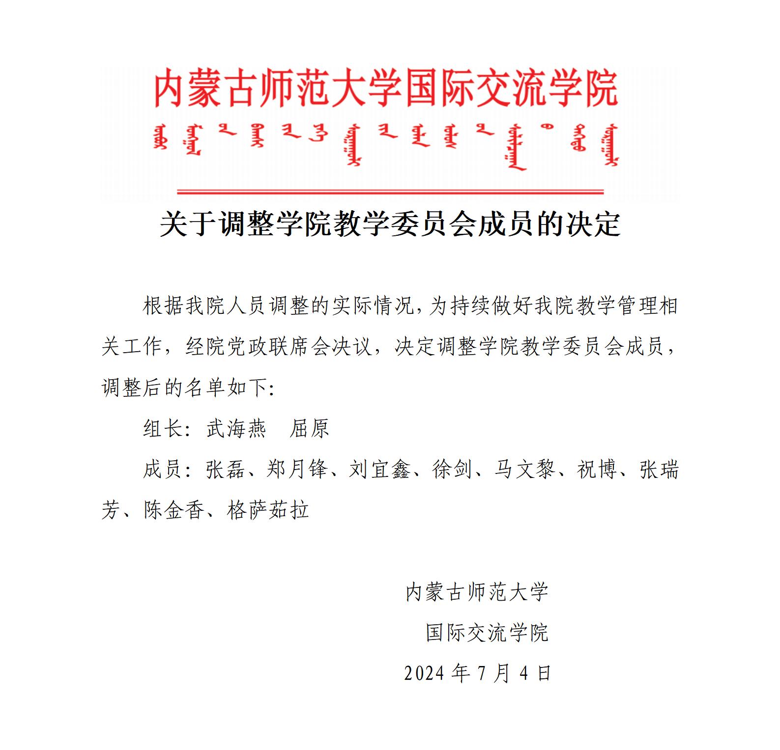 关于调整学院教学委员会成员的决定
