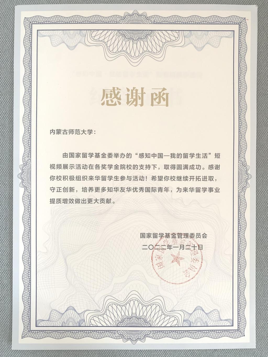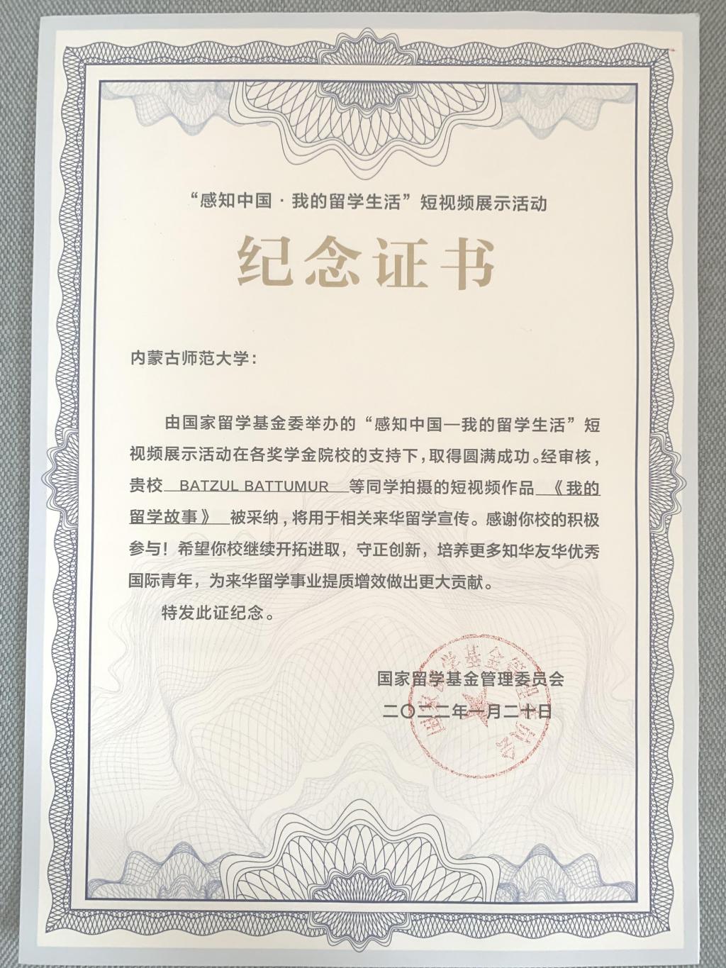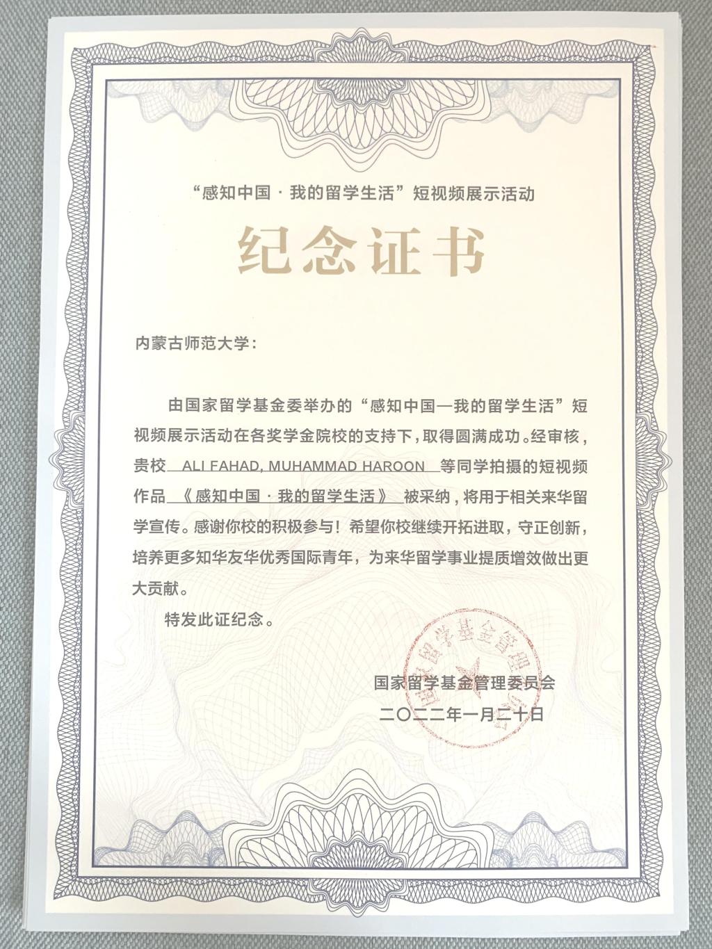 近日,国家留学基金管理委员会举办的“感知中国—我的留学生活”短视频展示活动结果公布。beat365官网beat365手机版官网选送的巴基斯坦籍中国政府奖学金生浩然(ALI FAHAD)、浩宁(HAROON MUHAMMAD )的《感知中国—我的留学生活》和蒙古籍中国政府奖学金生巴图珠拉(BATTUMUR BATZUL)的《我的留学故事》等两部作品获得纪念证书,学校同时收到国家留学基金管理委员会感谢函。